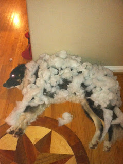 Murray got a new stuffed Beaver for xmas and last nite he brought it over for him and Daisy to play with....and this was the result! They de-fluffed it and then we covered Murman with the fluff.