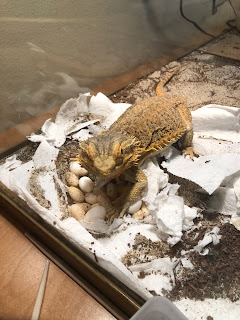 She didn't seem to care and quickly went back to being a calm bearded dragon who enjoys sunning herself and eating roaches and greens. She looked super skinny after laying all those eggs so she gets to eat as much as she wants.
